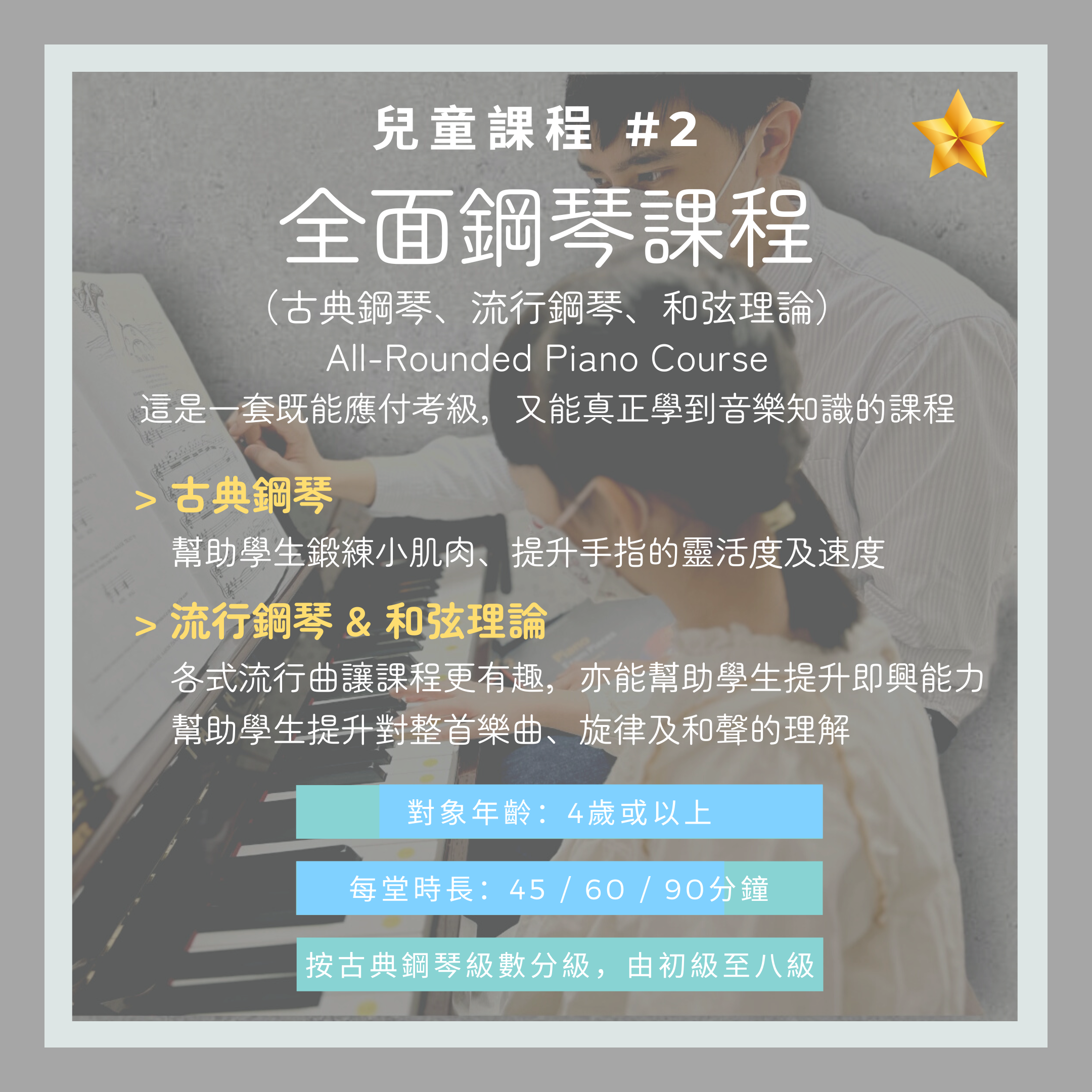 按古典鋼琴收費表收費,每節課加以額外$100即可升級為「全面鋼琴課程」。