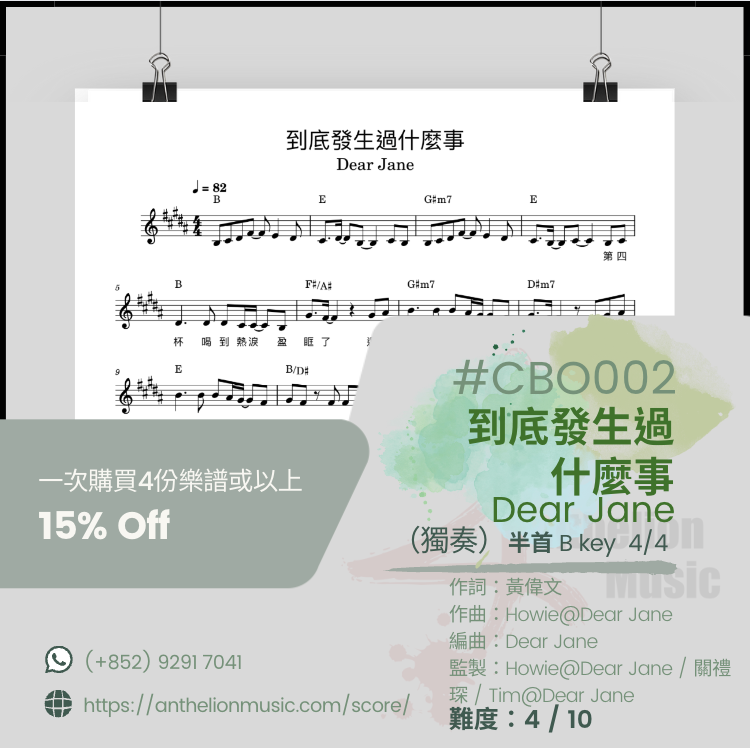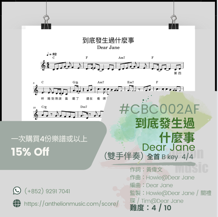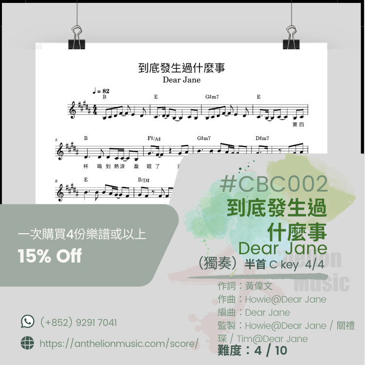 August 10, 2023 ⟪到底發生過什麼事⟫ [右手主旋律五線譜+ CHORDs// 獨奏譜] [ 伴奏譜 ] August 10, 2023/ JOYA. C #CBO002#CBC002$50 半首(獨奏)#CBC002AF$170 全首 (雙手伴奏) 🍃購買四首或以上可享有85折優專🍃⚠️注意購買# CBO002 或 # CBC002版本的現成樂譜,只有右手主旋律為五線譜(Lead Sheet)並沒有左手的五線譜。客戶可以選購雙手五線譜版本,或學習左手跟從樂譜所提供的樂弦,配以合適的Patterns來彈伴奏。💮# CBC002AF 這個版本是現成的伴奏樂譜,即為歌者伴奏或自彈自唱用💮⚠️一番心血,避免轉載⚠️