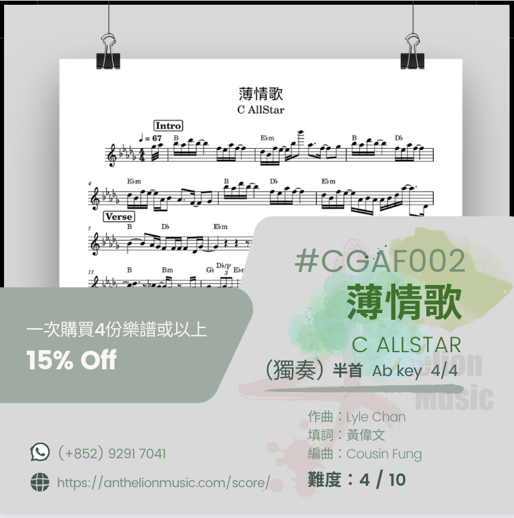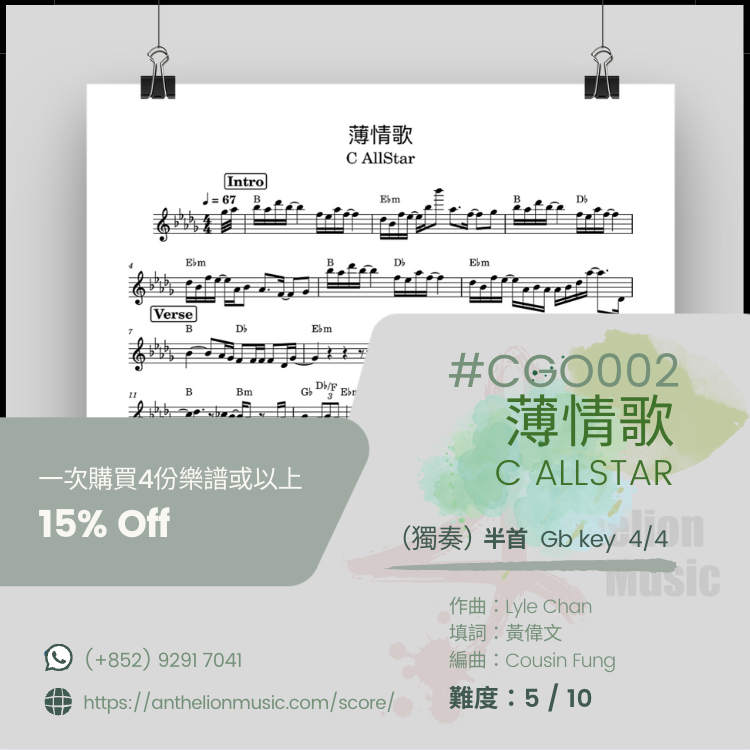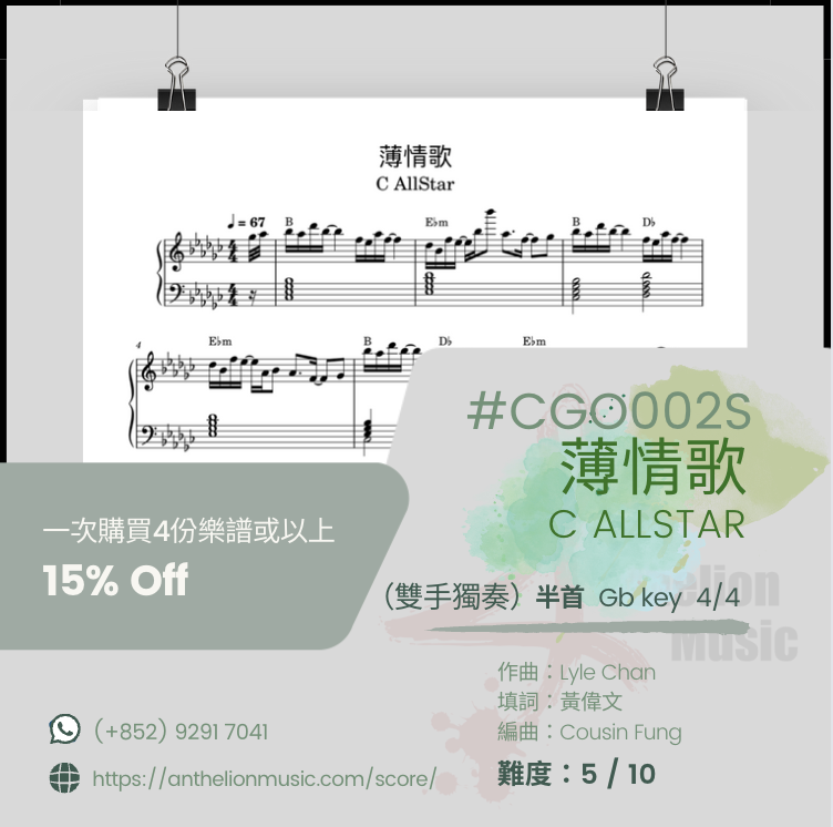 December 04, 2021 《薄情歌》【主旋律五線譜 + CHORDs // 獨奏譜】【右手主旋律五線譜+左手伴奏五線譜 】 December 04, 2021/ Evan Szeto #CGO002$50 半首(獨奏)#CGO002S$150 半首(雙手獨奏)#CGAF002$50 半首 (獨奏) 🍃購買四首或以上可享有85折優專🍃注意購買# CBO002 或 # CGAF002版本的現成樂譜,只有右手主旋律為五線譜(Lead Sheet)並沒有左手的五線譜。客戶可以選購雙手五線譜版本,或學習左手跟從樂譜所提供的樂弦,配以合適的Patterns來彈伴奏。💮若購買# CGO002S 版本的現成雙手五線樂譜,有右手主旋律五線譜和左手伴奏五線譜,客人若想自彈自唱或替別人伴奏的話,可選購「伴奏譜」的版本💮⚠️一番心血,避免轉載⚠️