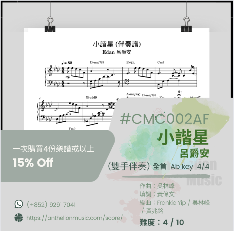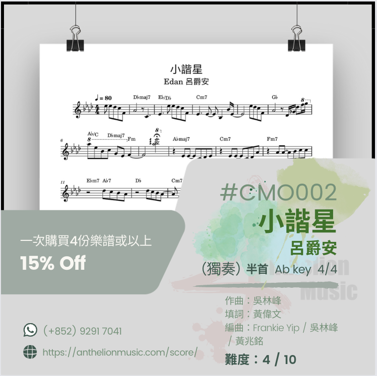 August 11, 2023 ⟪小諧星 ⟫ [右手主旋律五線譜+ CHORDs// 獨奏譜] [伴奏譜] August 11, 2023/ JOYA. C #CMO002 (Ab key) #CMC002 (C key) $50 半首(獨奏)#CMC002AF$170 全首 (雙手伴奏) 🍃購買四首或以上可享有85折優專🍃注意購買🏝️ # CMO002或 # CMC002 版本的現成樂譜,只有右手主旋律為五線譜(Lead Sheet)並沒有左手的五線譜。客戶可以選購雙手五線譜版本,或學習左手跟從樂譜所提供的樂弦,配以合適的Patterns來彈伴奏。💮#CMC002AF 為伴奏樂譜,即為歌者伴奏或自彈自唱適用💮