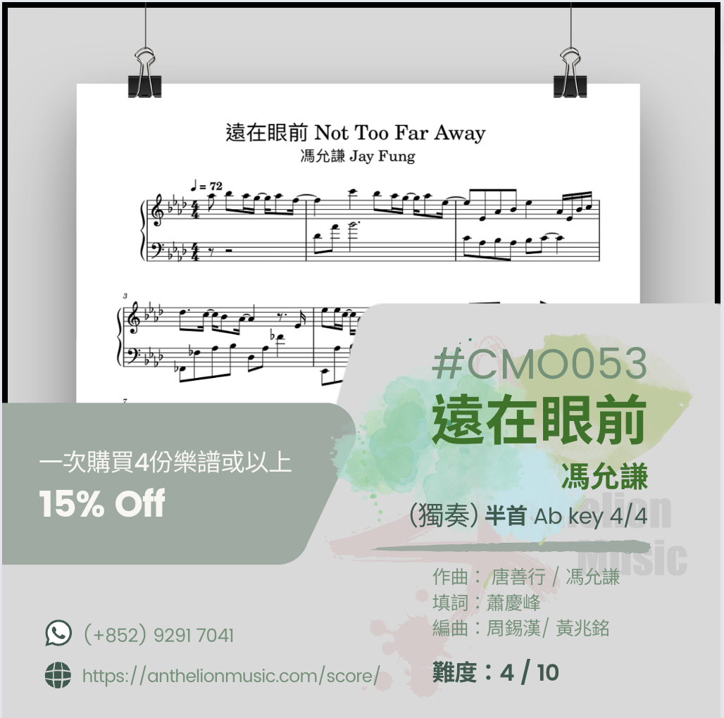 September 11, 2023 ⟪ 遠在眼前⟫ [右手主旋律五線譜+ CHORDs// 獨奏譜] [右手主旋律五線譜+ 左手伴奏五線譜// 雙手獨奏譜] September 11, 2023/ Joya.C #CMO053$50 半首(獨奏)# CMO053F$70 全首(獨奏)#CMO053SF$170 全首 (雙手獨奏) 🍃購買四首或以上可享有85折優專🍃注意購買🏝️# CMO053 或# CMO053F 版本的現成樂譜,只有右手主旋律為五線譜(Lead Sheet)並沒有左手的五線譜。客戶可以選購雙手五線譜版本,或學習左手跟從樂譜所提供的樂弦,配以合適的Patterns來彈伴奏。💮若購買# CMO053SF 版本的現成雙手五線樂譜,有右手主旋律五線譜和左手伴奏五線譜💮