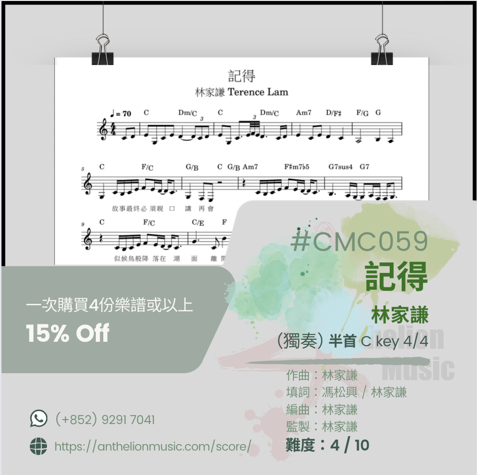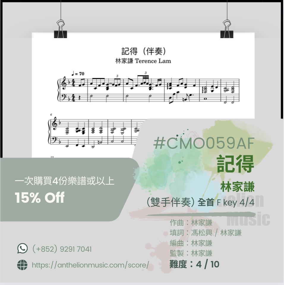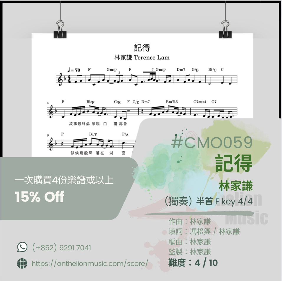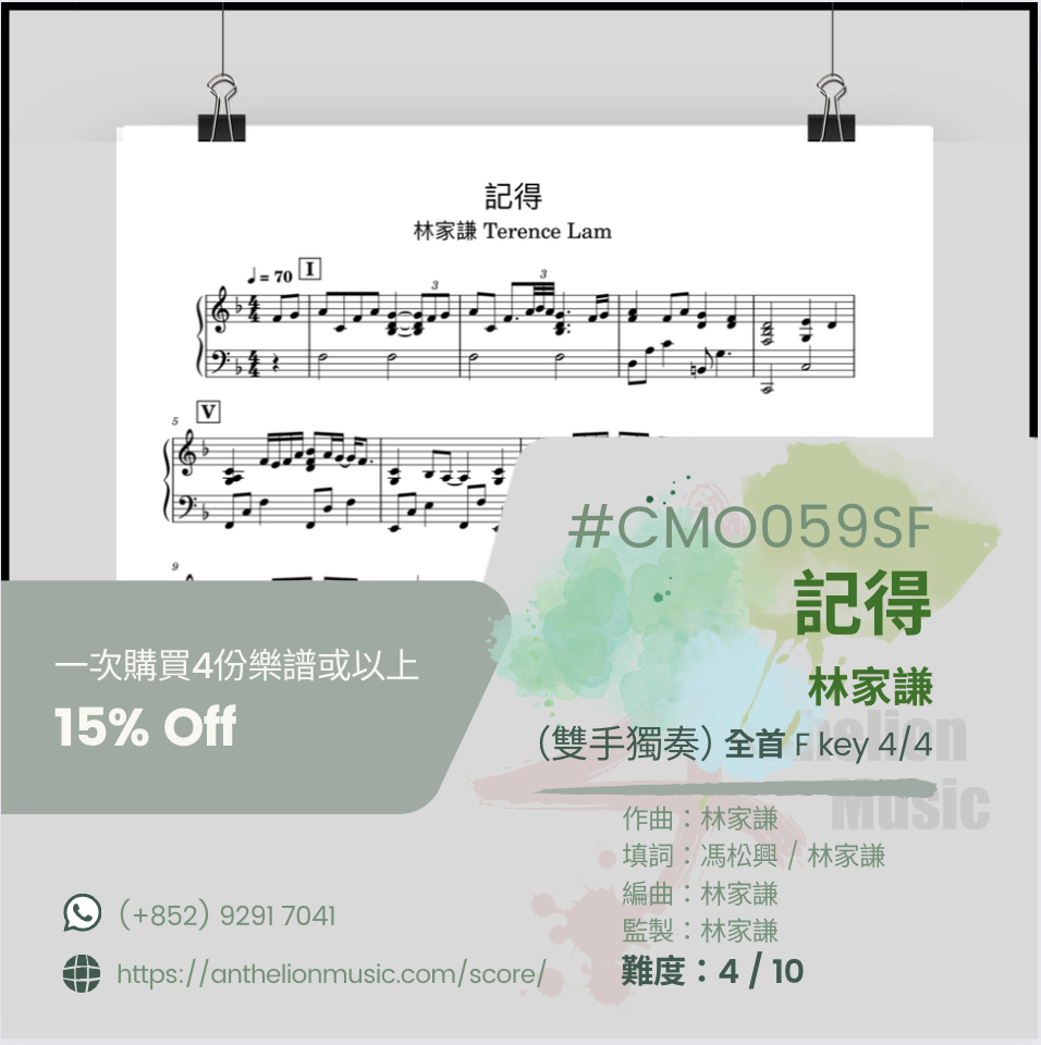 October 30, 2023 ⟪記得 ⟫ [右手主旋律五線譜+ CHORDs// 獨奏譜] [右手主旋律五線譜+ 左手伴奏五線譜//雙手獨奏譜] [伴奏譜] October 30, 2023/ Joya.C #CMO059#CMC059$50 半首(獨奏)#CMO059AF$170 全首 (雙手伴奏)#CMO059SF$170 全首(雙手獨奏)🍃購買四首或以上可享有85折優專🍃注意購買🏝️# CMO058 或 # CMC059版本的現成樂譜,只有右手主旋律為五線譜(Lead Sheet)並沒有左手的五線譜。客戶可以選購雙手五線譜版本,或學習左手跟從樂譜所提供的樂弦,配以合適的Patterns來彈伴奏。💮若購買 🏝️# CMO059SF版本的現成雙手五線樂譜,有右手主旋律五線譜和左手伴奏五線譜,客人若想自彈自唱或替別人伴奏的話,可選購🏝️# CMO059AF「伴奏譜」的版本💮