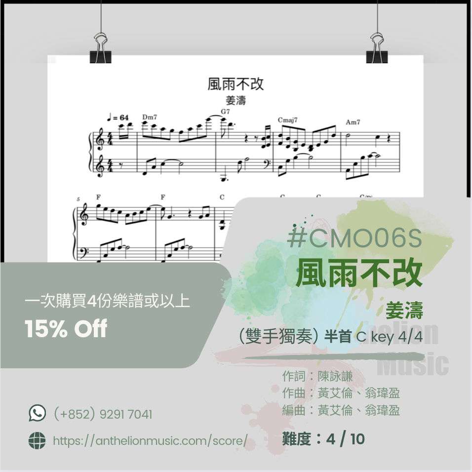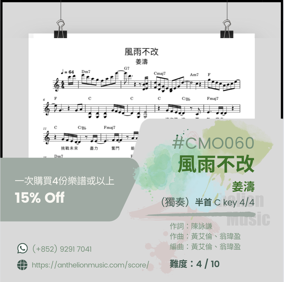 ⟪風雨不改 ⟫ [右手主旋律五線譜+ CHORDs// 獨奏譜] [右手主旋律五線譜+ 左手伴奏五線譜// 雙手獨奏譜]