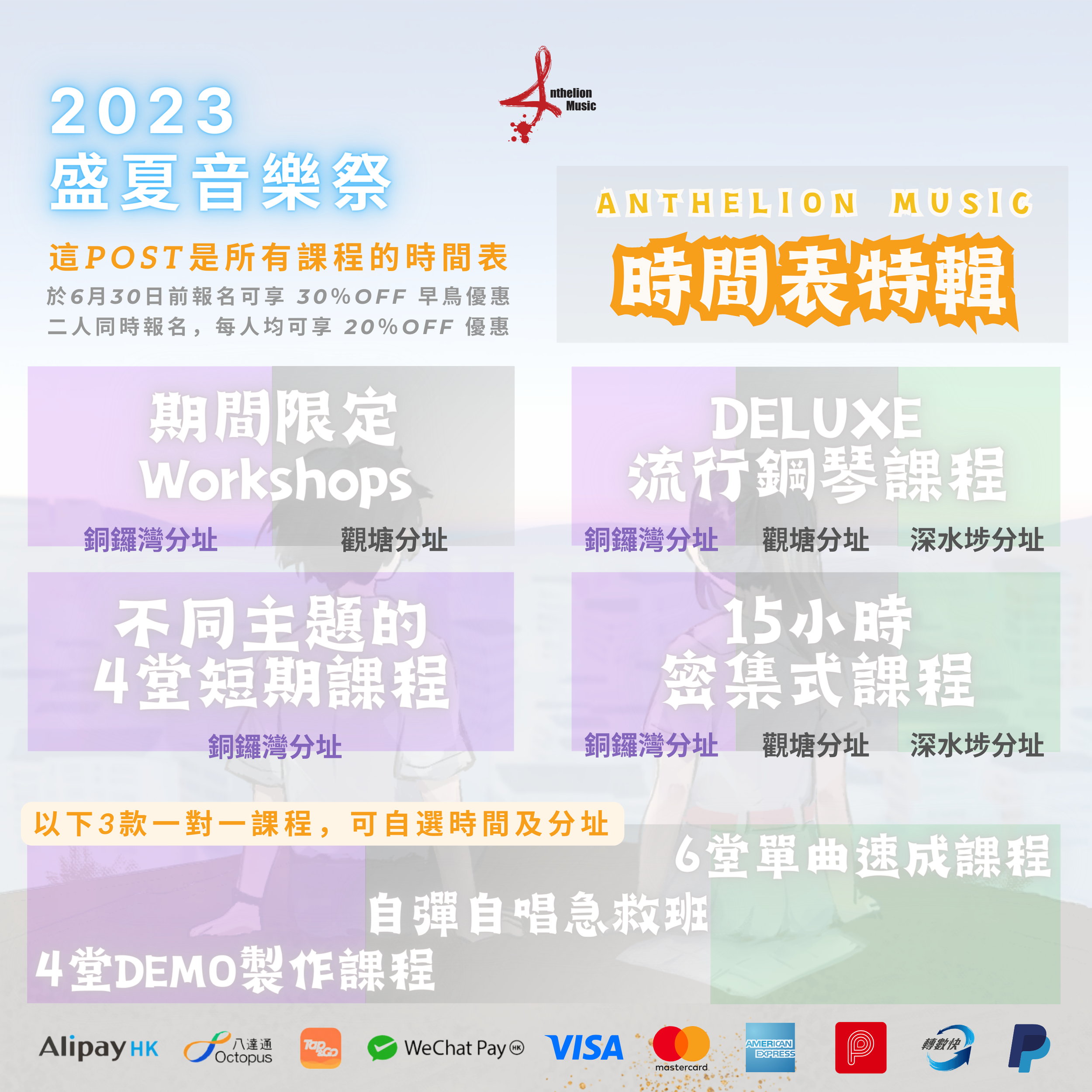 除了這課程外,我們在暑期更舉辦了其他不同的期間限定或短期課程,內容涵蓋面廣,涉獵流行音樂中的不同領域。對象除了中學生與大專生,亦包括成人、小學生,以及幼稚園生,快來了解更多我們的課程吧!